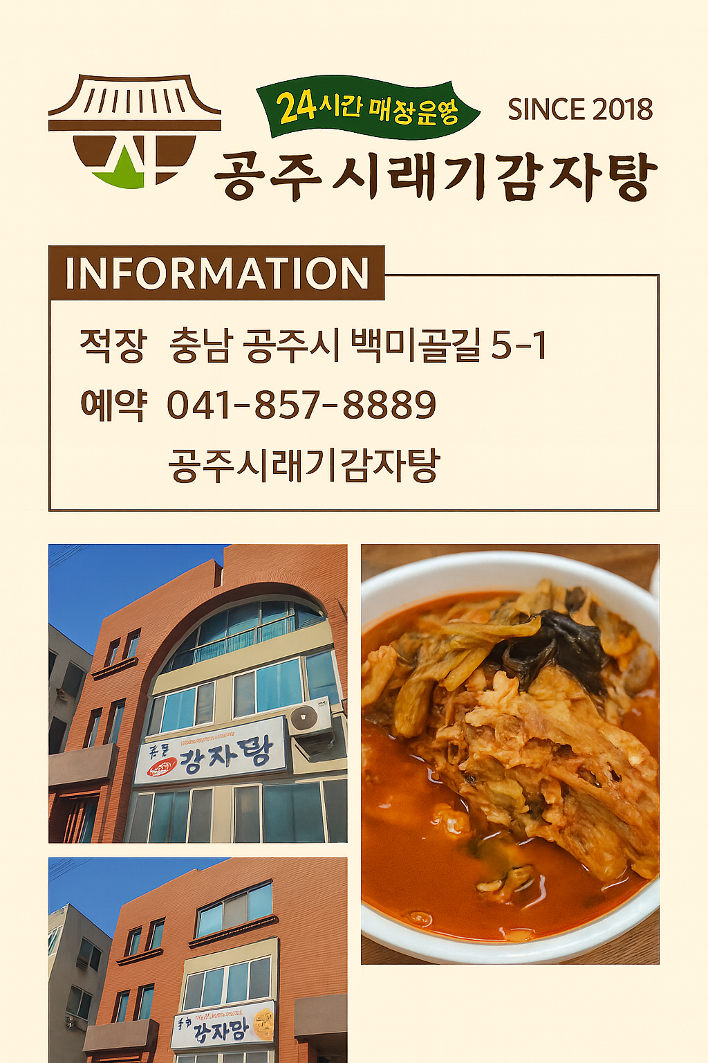 공주에 구수한 시래기와 진한 국물맛으로 소문난 공주 시래기 감자탕을 소개해볼까 해요. 이곳은 공주시 웅진로 5에 위치해 있으며, 24시간 영업으로 언제든 따뜻한 감자탕을 즐길 수 있는 곳이랍니다~ 🍲 공주 시래기 감자탕의 특징 ✔ 포장·배달 및 네이버 주문 가능 ✔ 24시간 매장 운영 ✔ 포장·배달 및 네이버 주문 가능 ✔ 깊고 진한 국물, 부드러운 등뼈 살매장 내부는 깔끔하고 따뜻한 조명으로 포근한 분위기입니다.주방이 오픈되어 조리 과정이 보이고,직원분들이 친절하게 응대해 주셔서 가족 단위 방문에도 좋습니다. 🥄 메뉴 구성 및 반찬- 깍두기- 고추&당근스틱- 쌈장- 와사비 간장속스깔끔하면서 감자탕과 궁합이 잘 맞는 구성이었어요. 감자탕은 시래기와 등뼈의 조합이 아주 좋습니다.국물은 진하면서도 개..