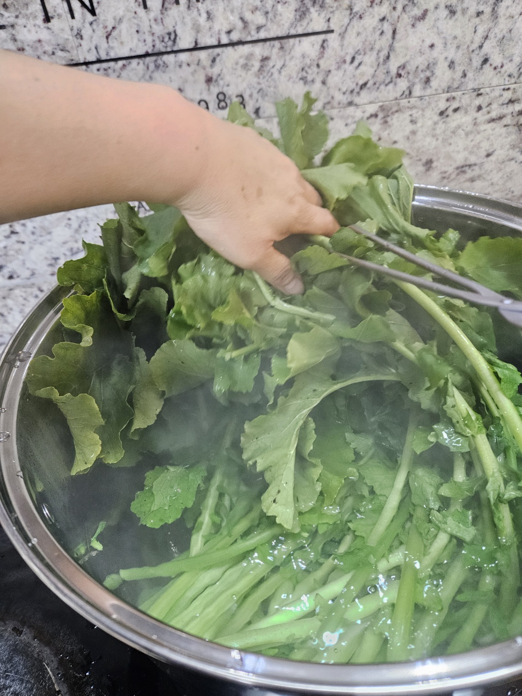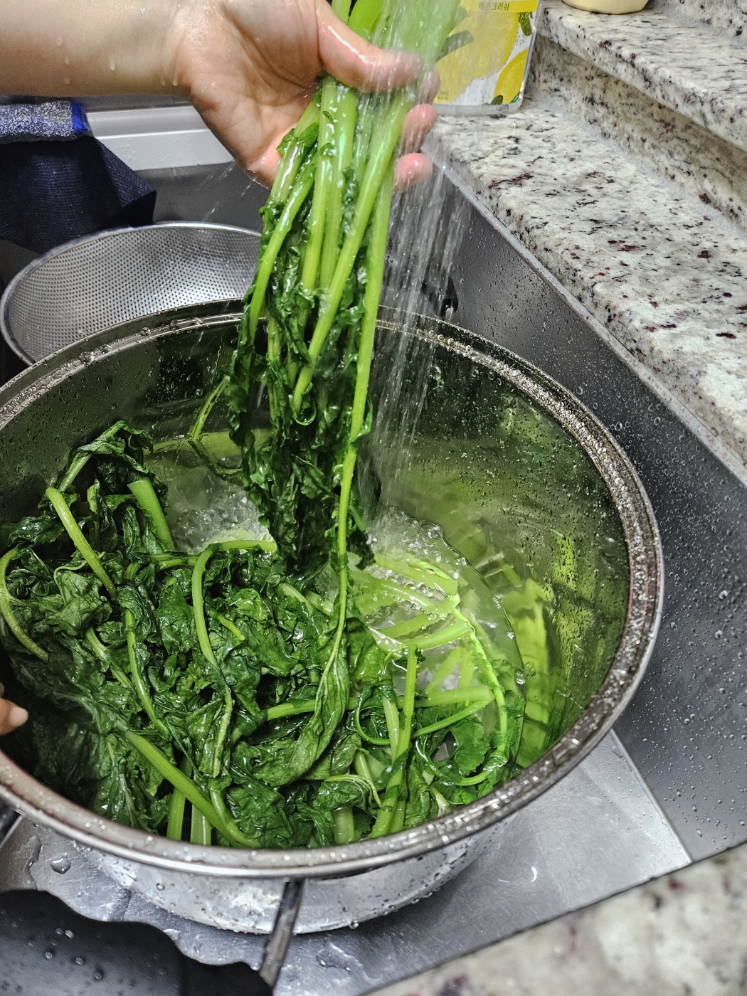 전체를 뒤집어가며 데쳐 초록빛을 유지합니다.