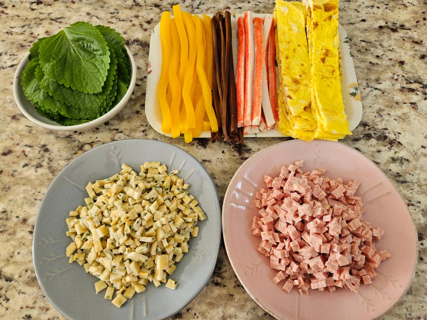 달걀지단, 맛살, 단무지, 우엉, 햄, 어묵, 깻잎을 준비했어요.