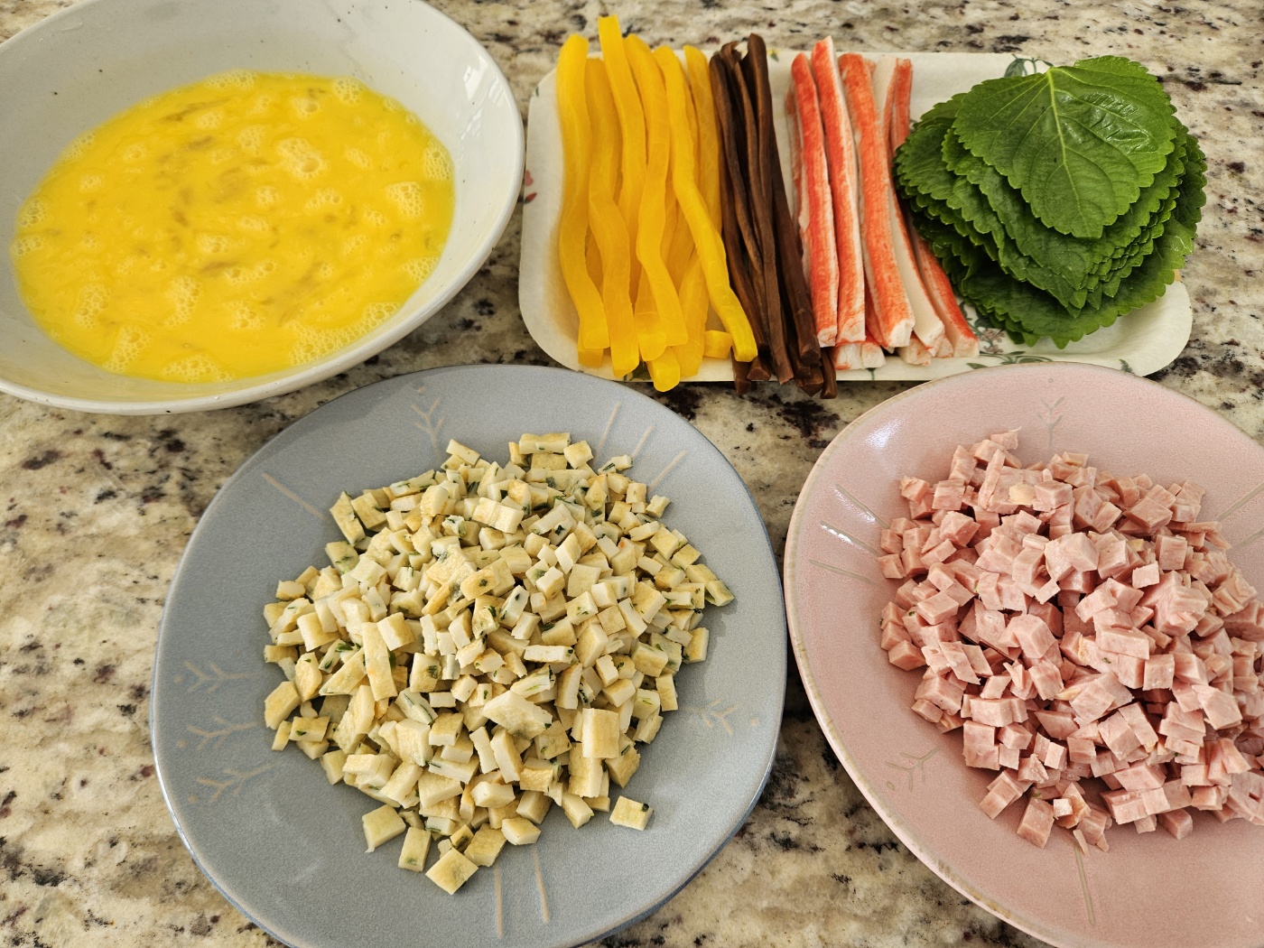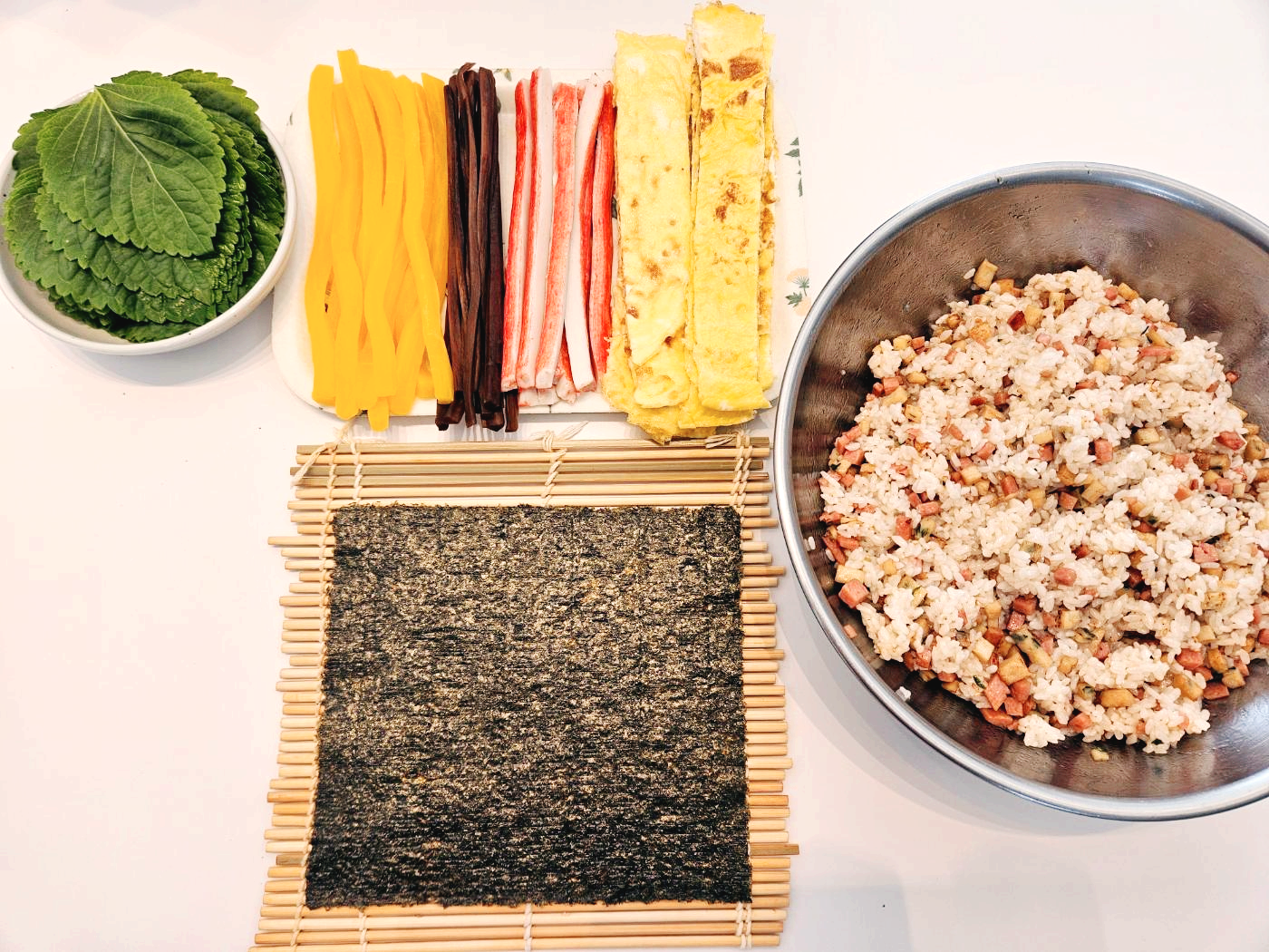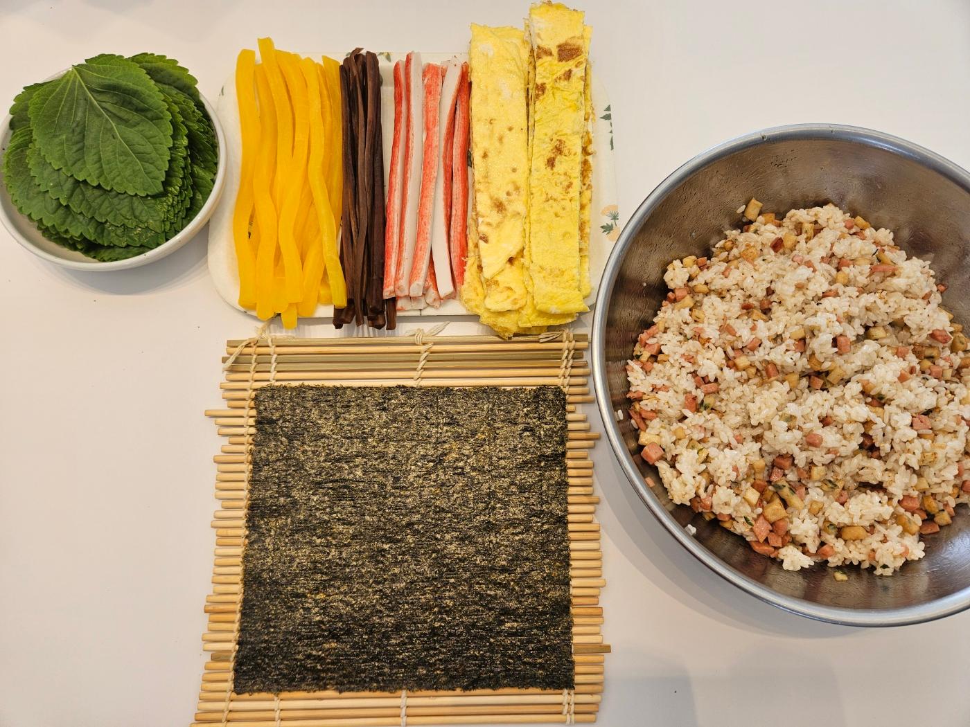 달걀지단, 맛살, 단무지, 우엉, 햄, 어묵, 깻잎을 준비했어요.