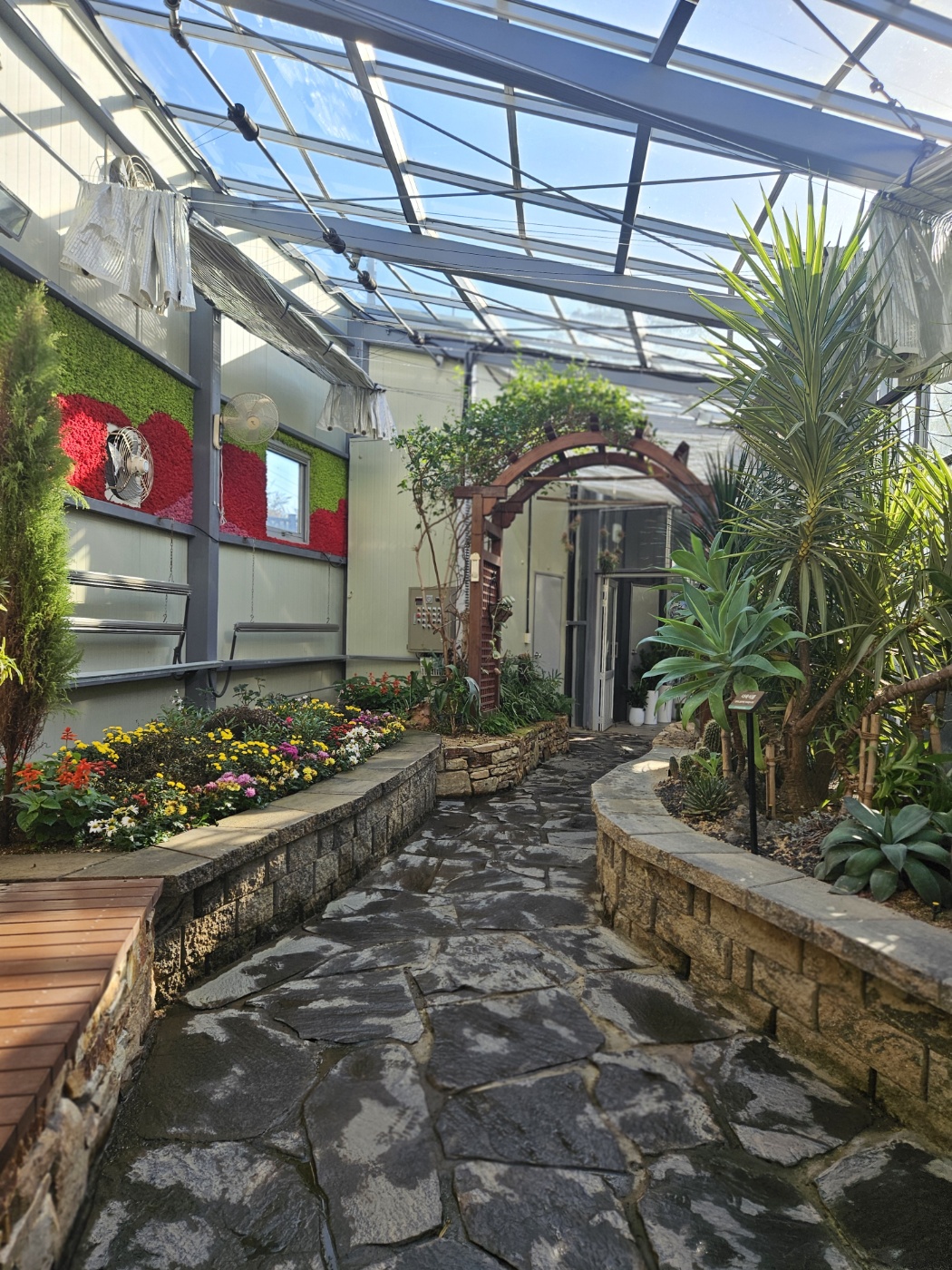 작지만 온실이 있어 잠시 들어보았어요~ 유리문을 열면 습도와 초록빛이 확 올라오고,