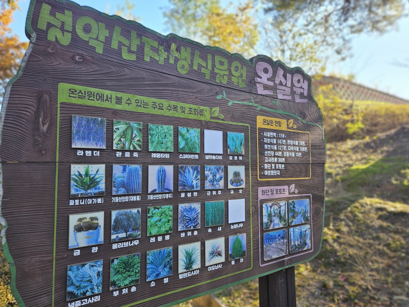 출구 쪽 안내판에는 라벤더, 알로에, 금관화 같은 식물 사진이 붙어 있어