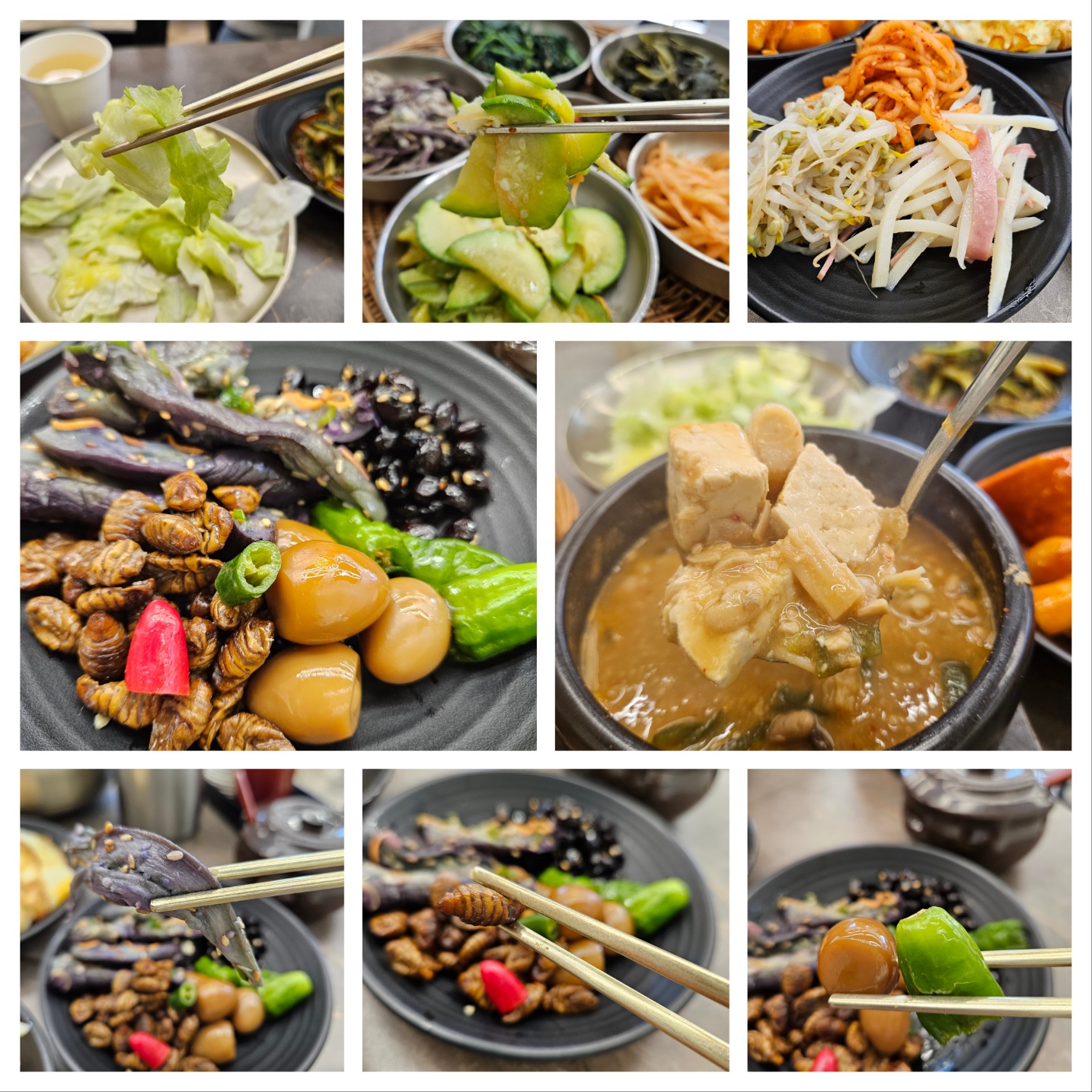 채반에 나오는 기본 반찬 외에 숙주, 가지나물, 메츄리알조림, 번데기도 있고