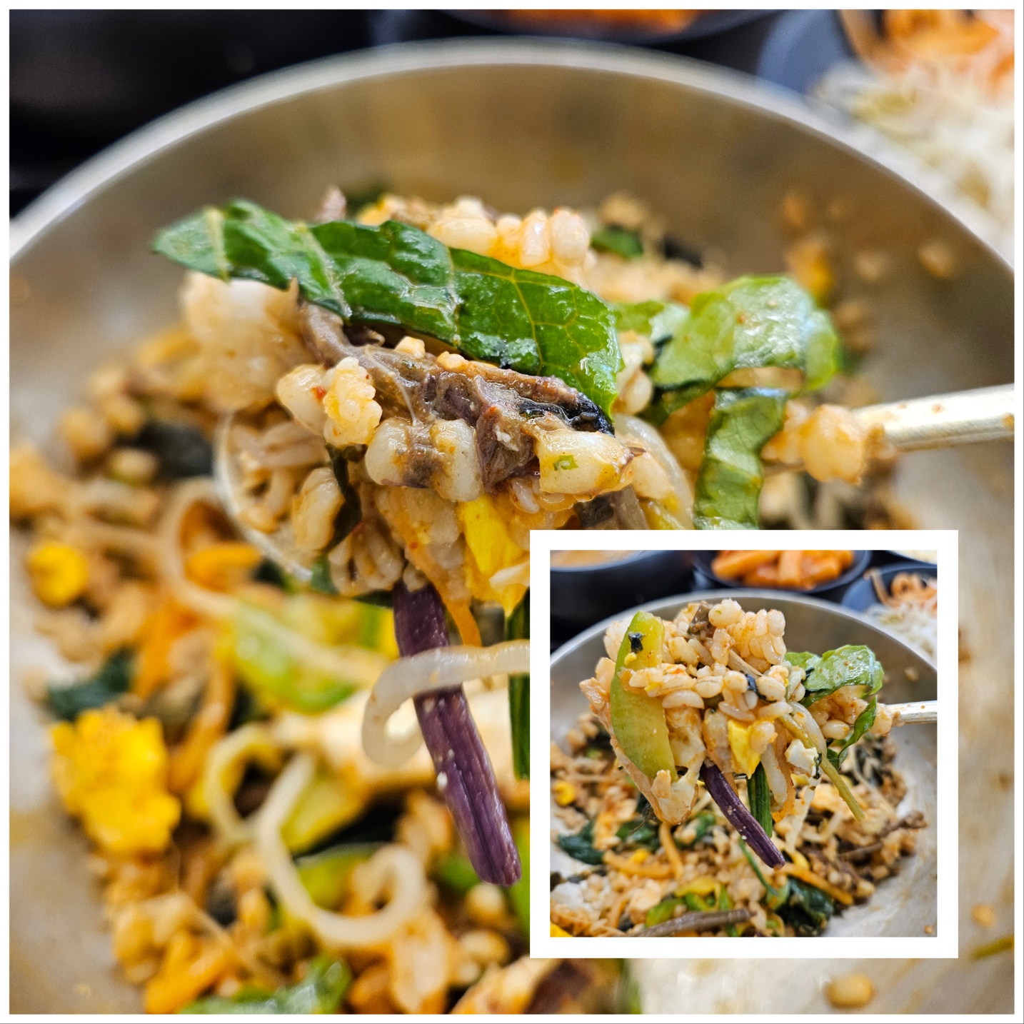 다 비벼진 보리밥을 한숟가락 가득 떠서 입안에 넣으니
