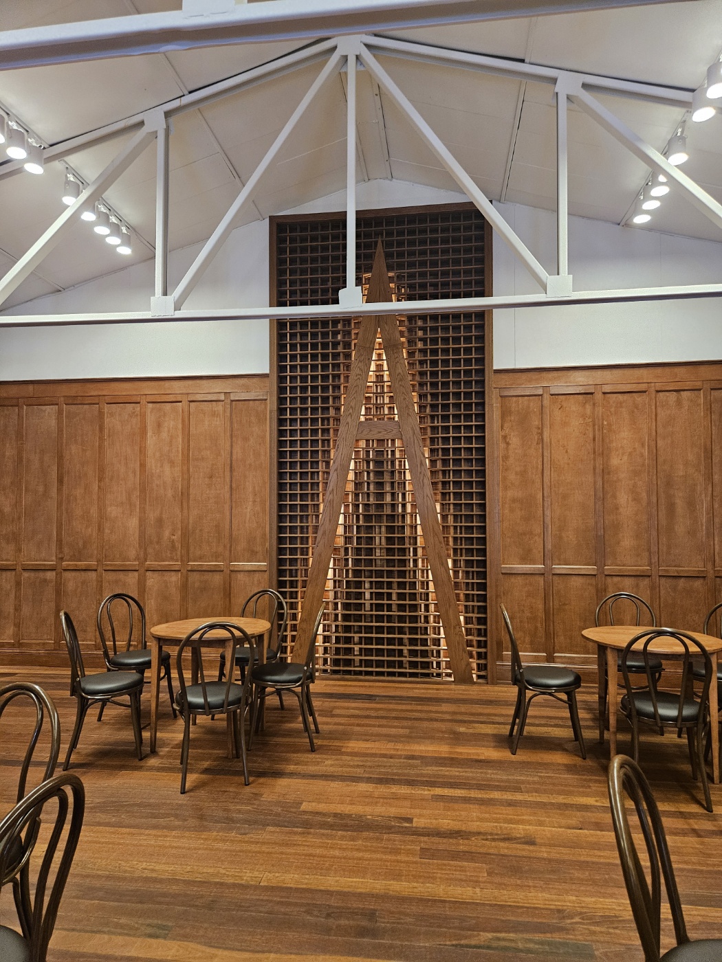 삼각 구조의 우드 아트월이 가장 먼저 보입니다.