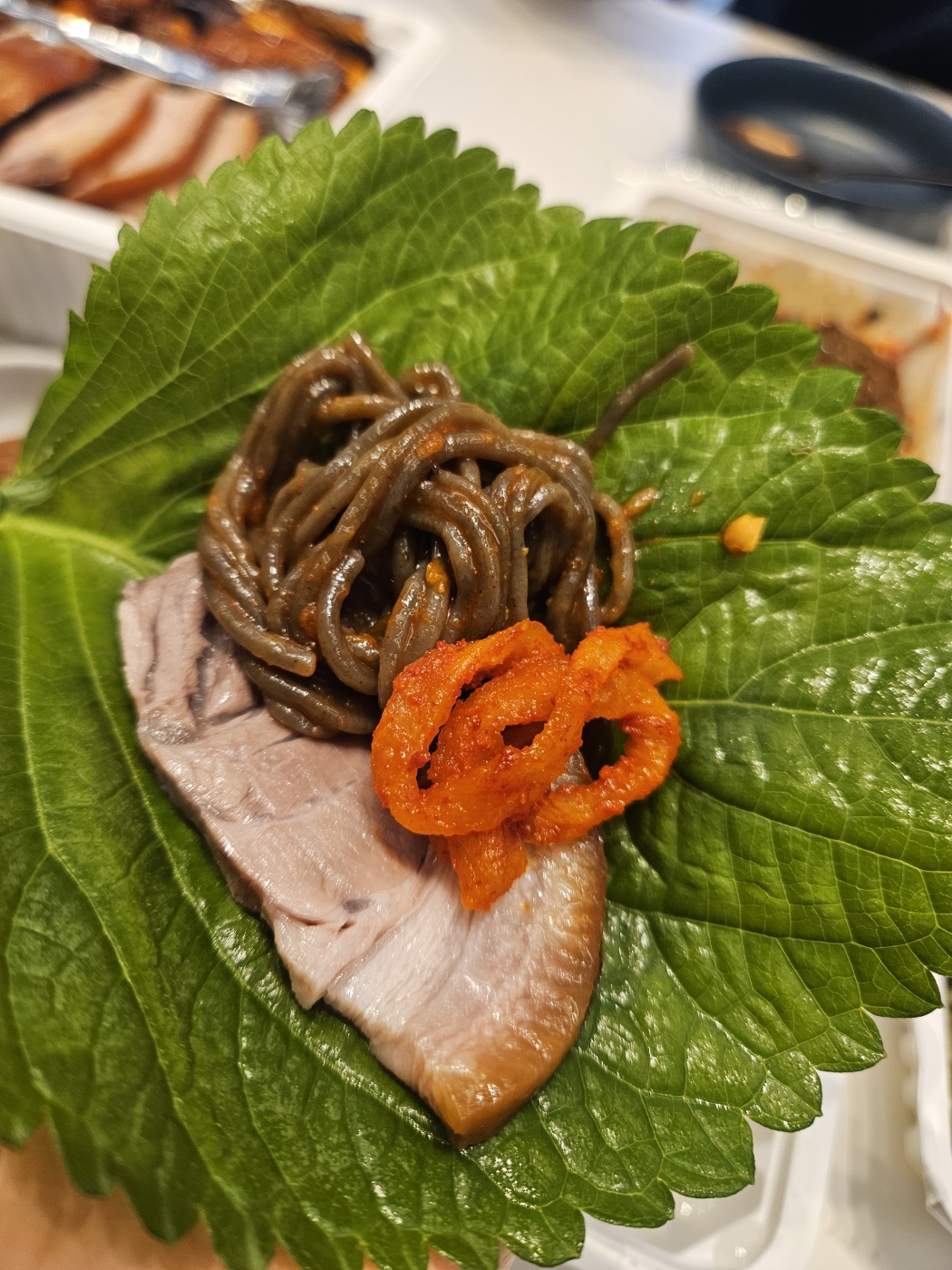 쌈 하나 싸서 족발, 막국수, 마늘까지 같이 먹으니
