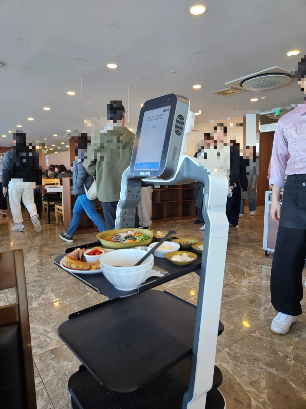 로봇이 음식을 테이블에 착착 가져다주는 모습이 참 인상적이었어요.