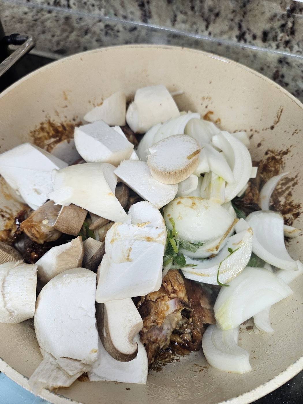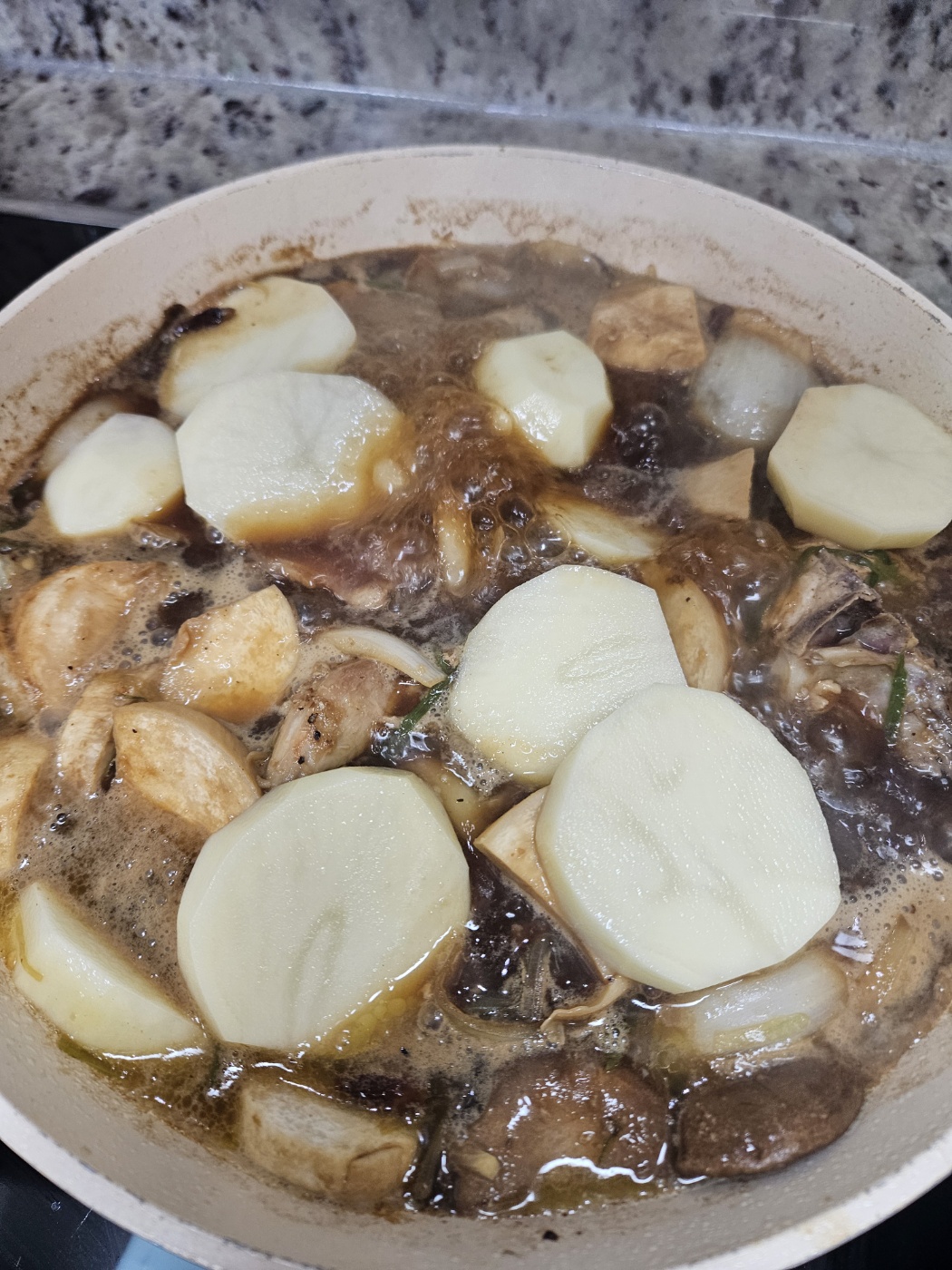 닭이 어느 정도 익으면 감자와 양파를 넣고 물을 자작하게 부어줬어요.