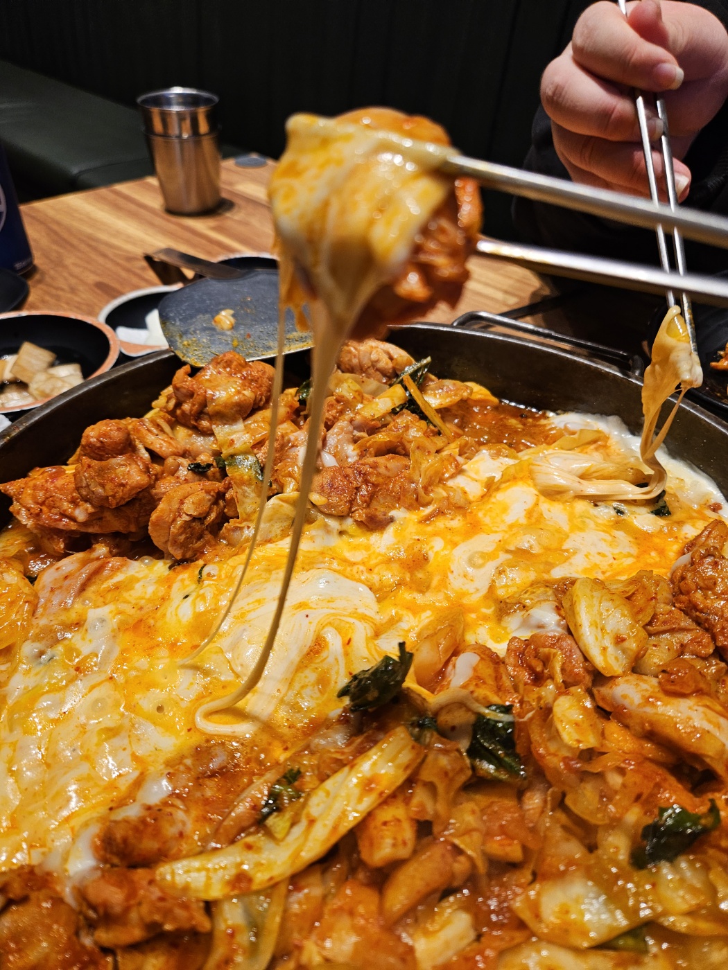 부드럽게 녹은 치즈에 닭갈비를 감싸서 입에 넣으니