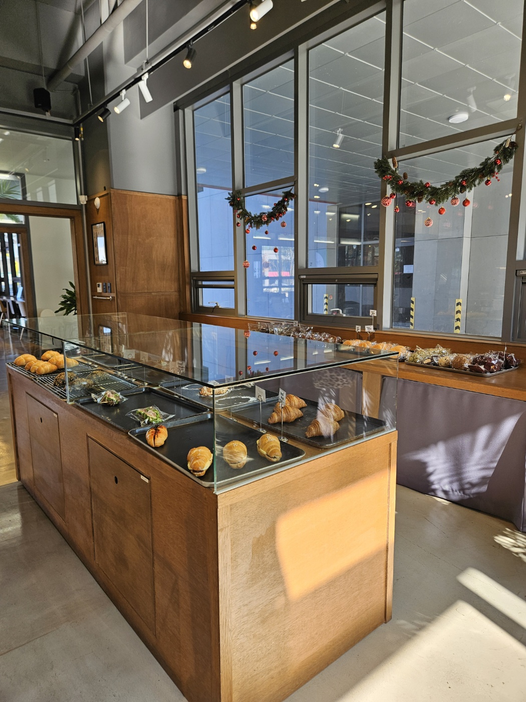 중앙의 오픈형 베이커리 진열대에는 오늘 만들어진 빵과 디저트들이 준비되어 있고